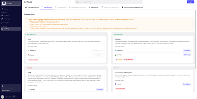 Note: Before you can use Stage Configuration, Guidance Configuration, or Smart Field Suggestions, please ensure you have at least 10 opportunities and about 15 transcripts or emails ingested.